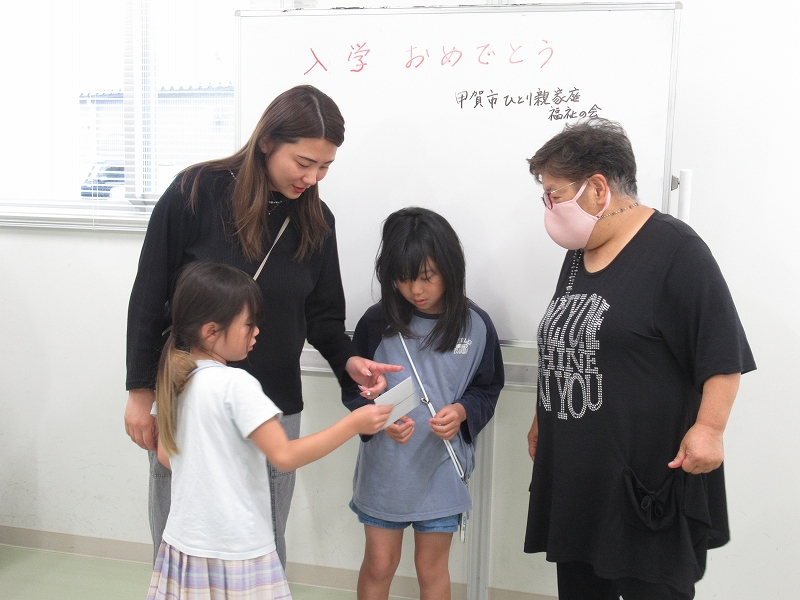 ひとり親家庭の会員で、お子さんが小学校、中学校、高校へ進学された方々へ、5月31日、甲賀市水口町まるーむにて、ささやかながらお祝いの会をさせていただきました。